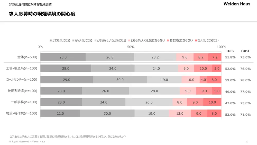 特にコールセンター従事者においては8割弱が職場の喫煙所の有無を気にしており、「喫煙者の肩身が狭い業種」「喫煙環境が整っていない事業者が多い」といった仮説が浮かび上がります。