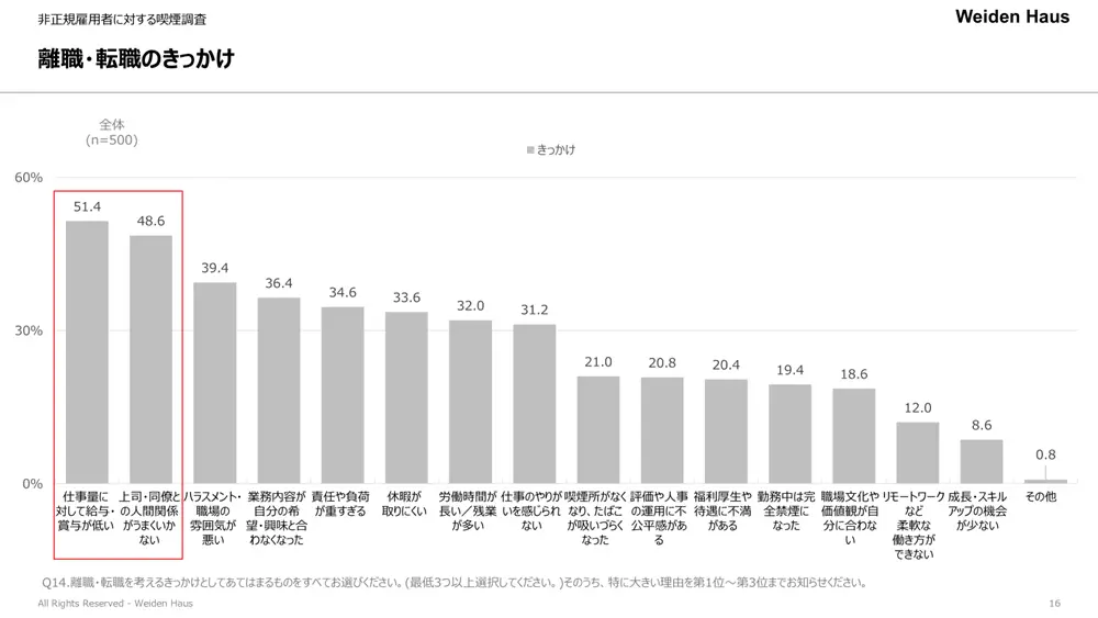 また、非正規雇用者にとって離職・転職を考えるきっかけとして「人間関係がうまくいかない」が「仕事量に対して給与・賞与が低い」に次いで2番目に高くなっています。この結果から、非正規雇用は職場での人間関係がうまくいくことを望んでいることがわかり、彼らにとって喫煙所は「単に喫煙ができる場」にとどまらず、「人間関係を育むコミュニケーションの場」として重要であることが推察できます。