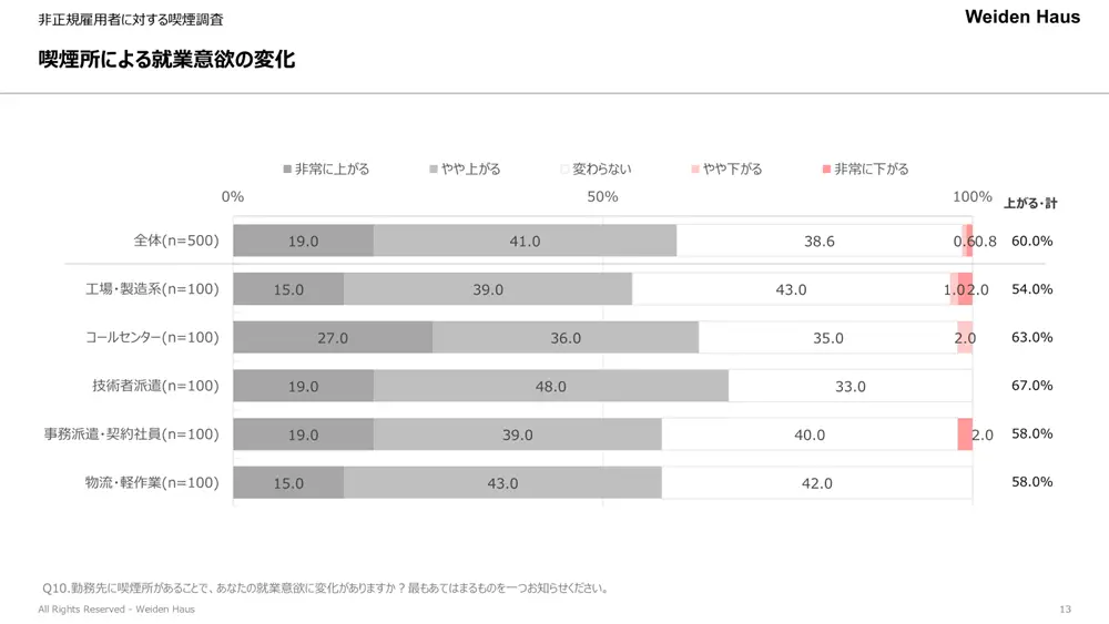 本調査から、職場内に喫煙所があることは、非正規雇用の喫煙者にとって就業意欲や会社の満足度が上がる重要な要素であることが明らかです。とくに、職場の喫煙所が撤去された場合、喫煙者の約2割が転職を検討するという、意外な意識実態がわかりました。