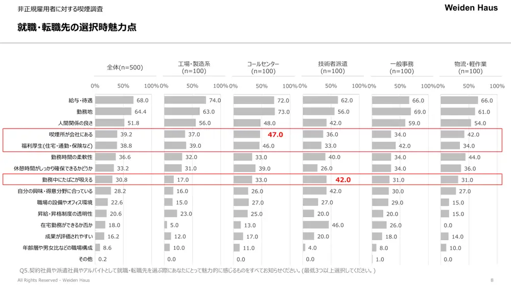 実際に就職先・転職先を選ぶにあたって何に魅力を感じるかを聞いたところ、「喫煙所が会社にある」ことは「福利厚生」と同程度魅力を感じていることが今回の調査でわかりました。